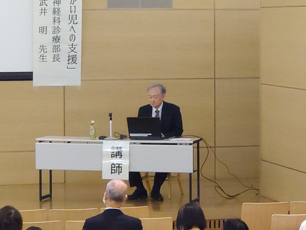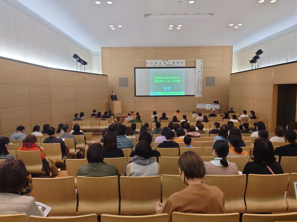 大分県福祉保健部障害福祉課と別府発達医療センター主催のもと、大分県立図書館にて「子育て講演会」を開催いたしました。講師には、旭川病院の武井 明先生をお招きし、自閉スペクトラム症(ASD)を中心に、武井先生の診察してきた具体的な事例をいくつも挙げて、子どもたちの様子や成長を解説していただきました。アニメやゲームに救われる子、理解ある大人(親、先生、職場の上司)との出会いなど、1つ1つの事例で感心の声が上がる場面もあり、非常に参加された方の満足度が高い講演会でした。